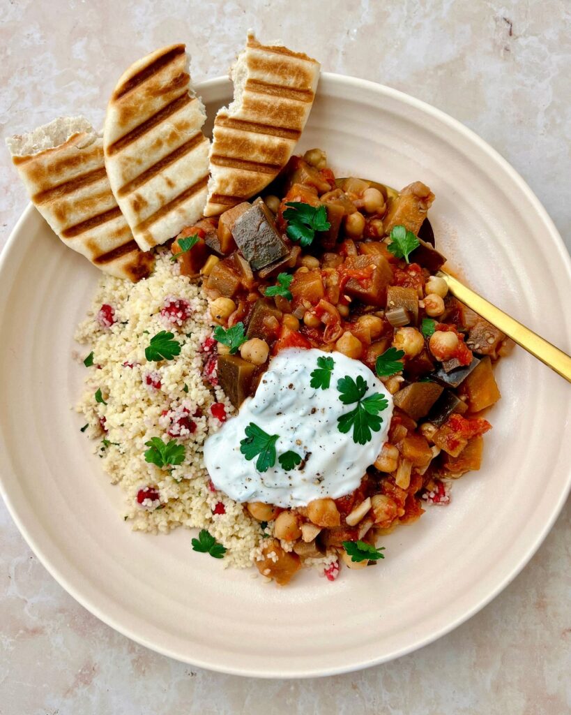 AUBERGINE-KIKKERERWTENSTOOF MET FRISSE COUSCOUS, YOGHURT-MUNTSAUS & NAANBROOD