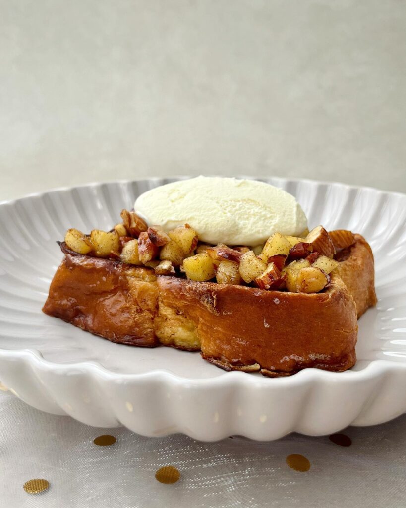 5. Verdeel de appel met amandelen over de brioche wentelteefjes. Doe bovenop een bol vanille-ijs.