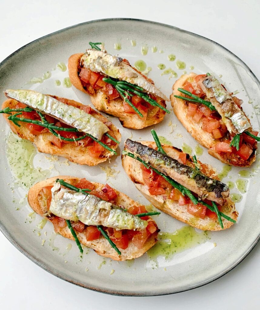 BRUSCHETTA MET SARDIENTJES, TOMATENSALSA EN BASILICUMOLIE