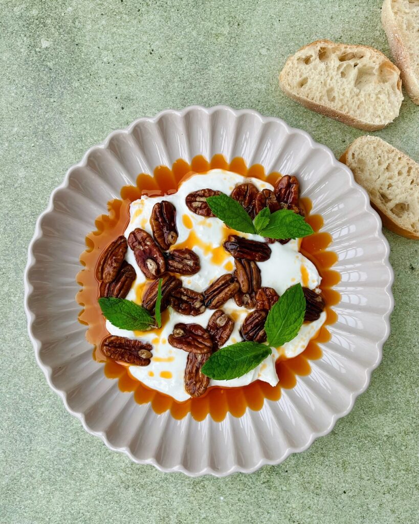 2. Snijd de burrata open en verdeel over een bord. Doe de chili olie en gekarameliseerde pecannoten erover. Garneer met munt.