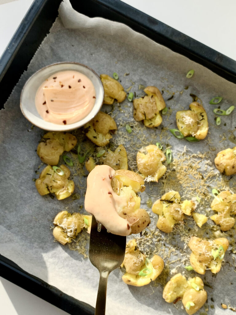 CRISPY SMASHED POTATOES MET SRIRACHAMAYO
