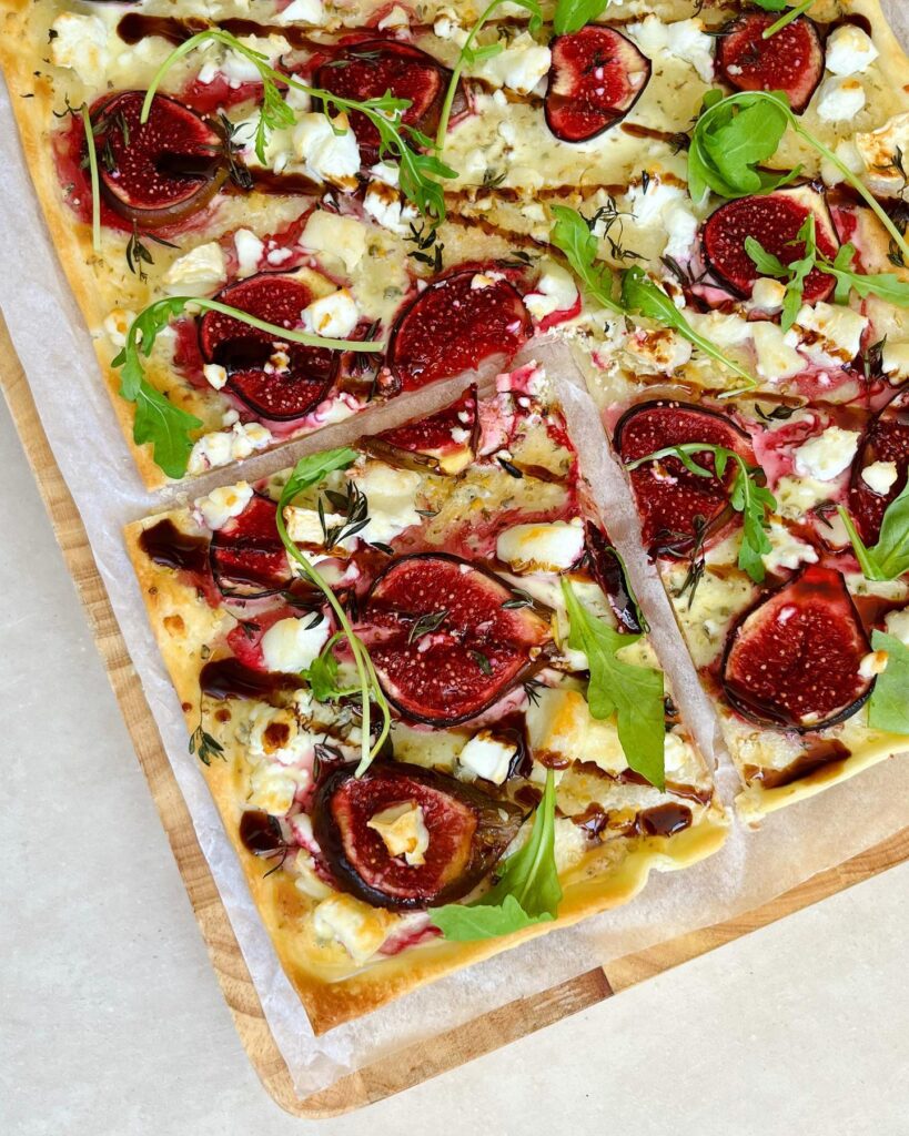 4. Besmeer het deeg met met crème fraîche mengsel. Beleg vervolgens met de plakken vijg. Verbrokkel de geitenkaas erover. Strooi de tijm erover.