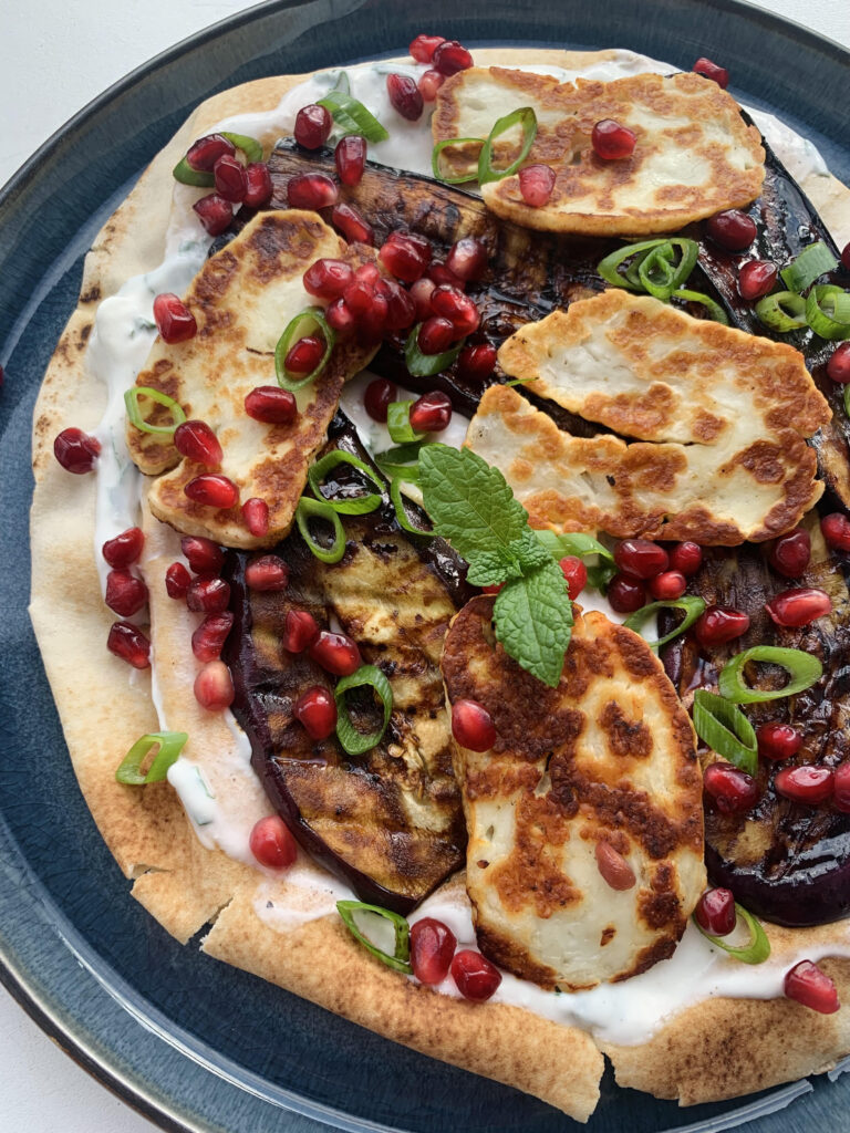 FLATBREAD MET STICKY AUBERGINE, HALLOUMI, GRANAATAPPEL & YOGHURT-MUNTSAUS