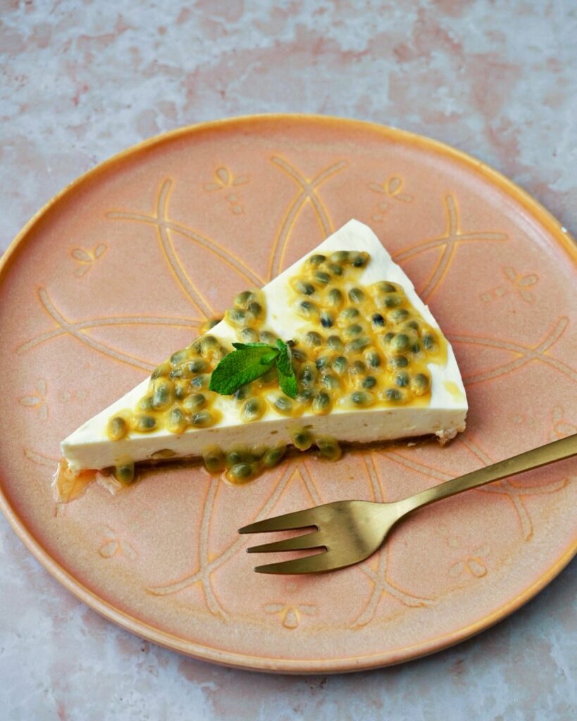 3. Haal de springvorm uit de koelkast. Schenk het kwarkmengsel over de bodem. Dek af met folie en laat voor minimaal 4 uur opstijven in de koelkast. Garneer voor het serveren met het vruchtvlees van de passievruchten.
