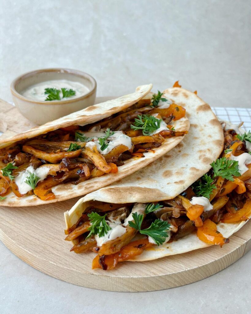 WRAPS MET OESTERZWAM, PAPRIKA EN PETERSELIE YOGHURTSAUS